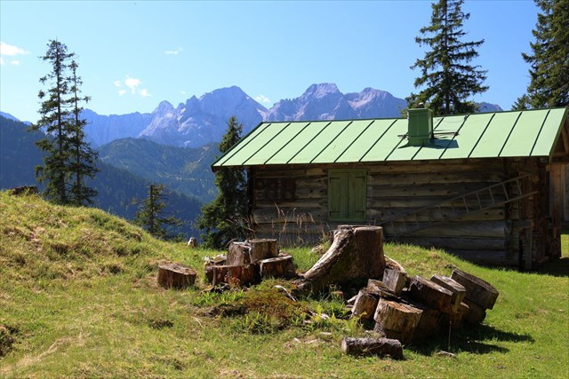 Über beide Varianten erreichen wir in einer Höhe von 1664m ein paar Jagdhütten. Direkt vor den Hütten macht der Weg wieder eine scharfe Rechtskurve.