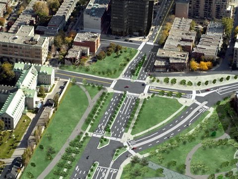 Avec la complétion récente de l'aménagement paysager l'intersection a repris sa beauté d'antan, et l'on retrouve la perspective, en venant du sud, sur l'avenue du Parc et du Mont-Royal.