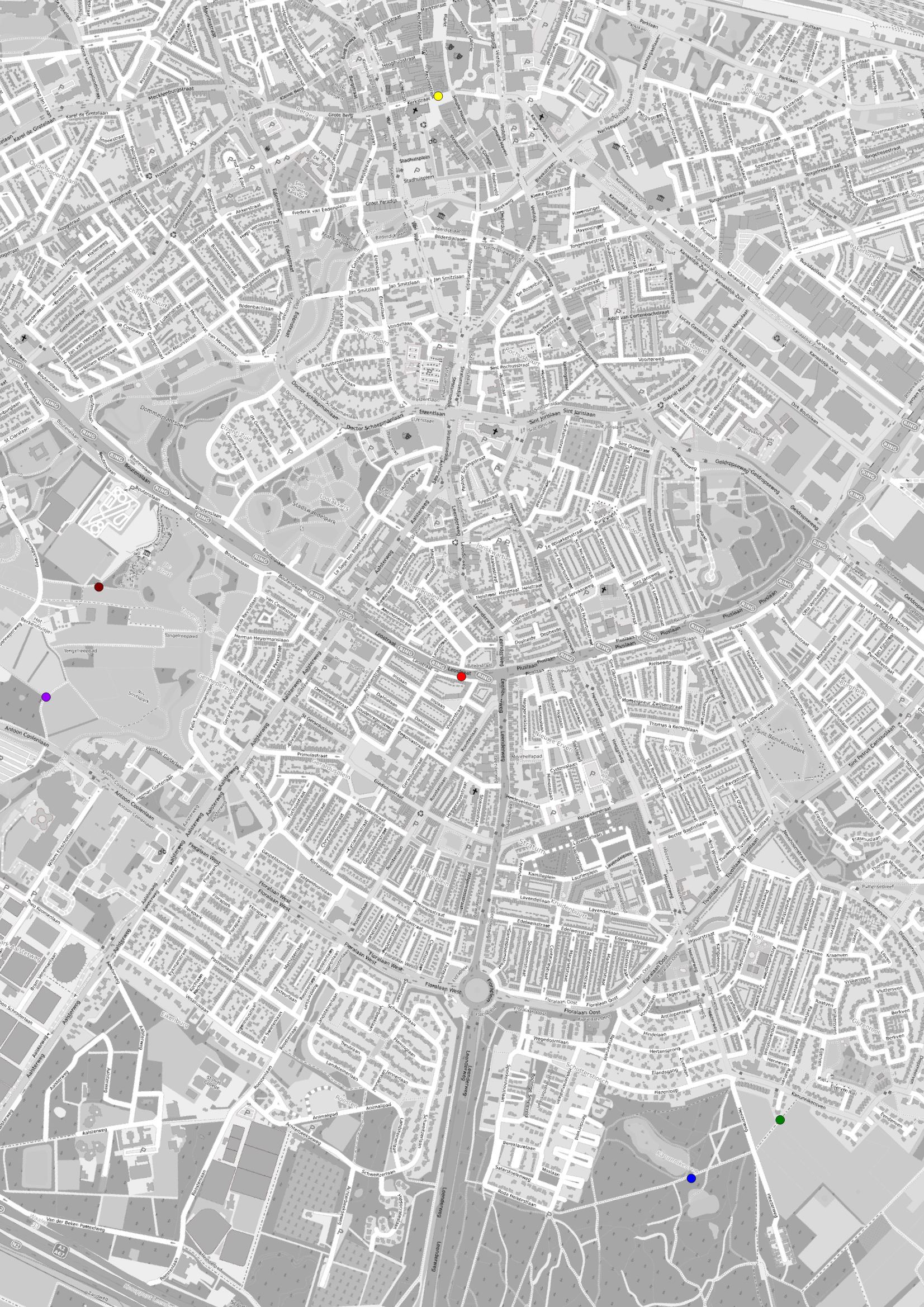 Thuis kun je je artistieke talenten testen. Print onderstaande plattegrond uit en zet stipjes op de locaties van de lantaarnpalen. Op de plattegrond heb je al 6 stipjes “kado” gekregen.