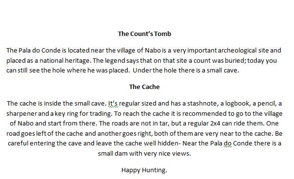 A cache encontra-se na pequena gruta debaixo do buraco da rocha. È de tamanho regular e possui inicialmente um stashnote, um logbook, um lápis, uma afia e um porta-chaves para troca. Para chegar à cache recomenda-se que se dirijam primeiro à aldeia do Nabo e a partir daí sigam por caminhos de monte até à cache. Existem dois caminhos até ela. Um deles, que permite a um 2x4 ficar a poucos metros acima da cache e o outro que apenas é recomendado a Jipe ou a bicicleta que o irá levar a 2/3 metros da cache. Pede-se que tenham cuidado a entrar na gruta e que deixem a cache bem escondida como a encontraram. Perto dacache, ou seja, na Pala do Conde existe uma pequena barragem com vistas magníficas. Boa Cachada!