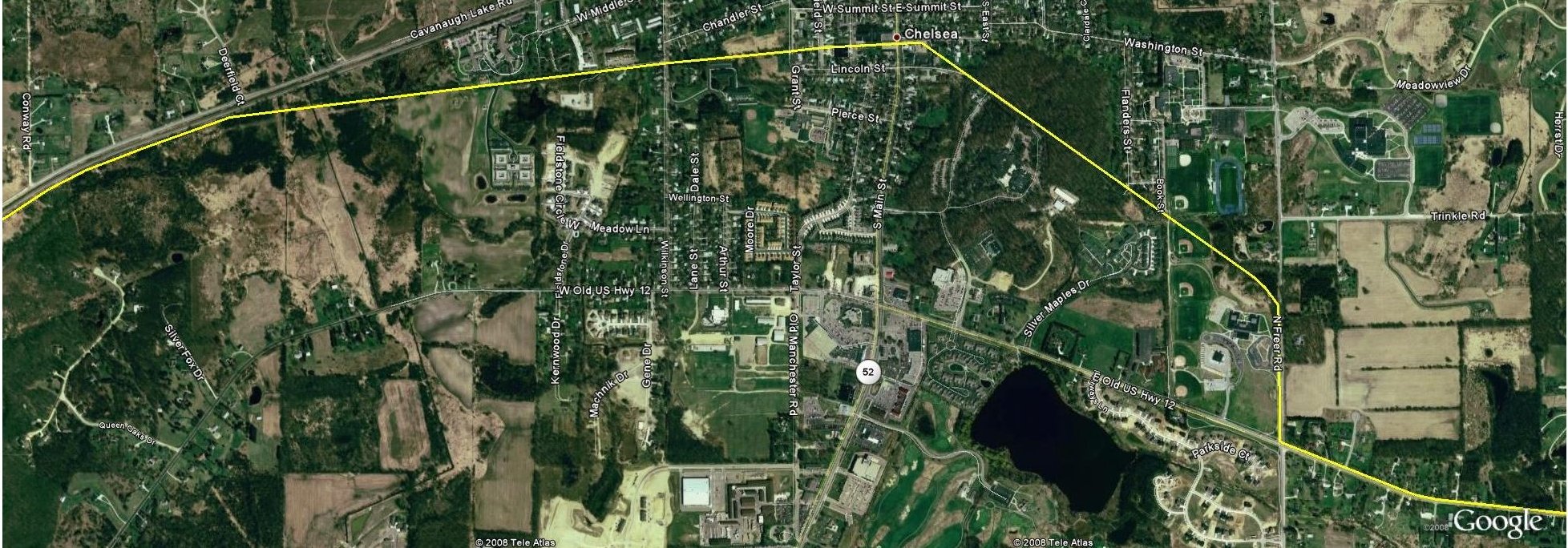 Route of the Interurban Track Shown Over Satellite Photo of Present-Day Chelsea