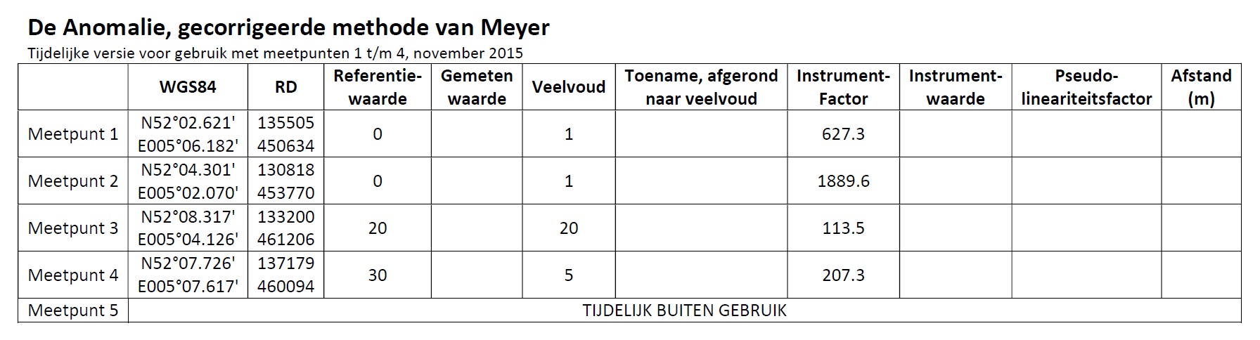 In de loop der jaren zijn deze objecten verwerkt in een vijftal meetinstrumenten, waarmee de locatie van de Anomalie bij toepassing van de gecorrigeerde methode van Meyer met aanzienlijke nauwkeurigheid kan worden bepaald. Daarbij is van elk instrument het volume of gewicht zonder invloed van de Anomalie vastgesteld, dit is de referentiewaarde. De instrumentfactor corrigeert voor de gebruikte eenheid en de gevoeligheid ten opzichte van de andere instrumenten. De instrumentfactor, vermenigvuldigd met de gemeten afwijking ten opzichte van de referentiewaarde is de instrumentwaarde. De instrumentwaarden worden gerangschikt naar grootte en gecorrigeerd met de zogenaamde pseudo-lineariteitsfactor, waarbij de instrumentwaarden van klein naar groot worden vermenigvuldigd met de afnemende factoren 1, 0.9, 0.8 en 0.7.