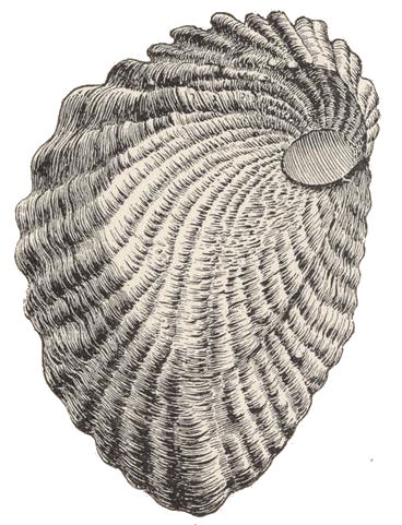 - Ceratostreon texanum - (From the Pycnodonteidae Family.) Another bivalve with a curved rib design and a small attachment scar on it’s lower valve.