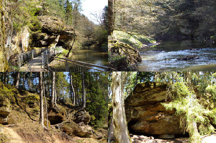 2.: Go to sign 2 of the nature trail. There you gonna find out that the river formed caves ("Höhlen") and ... .