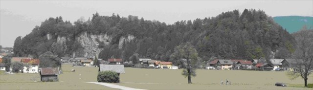 In the northern half of the mountain there are a late gothic church, some residential and farm buildings.