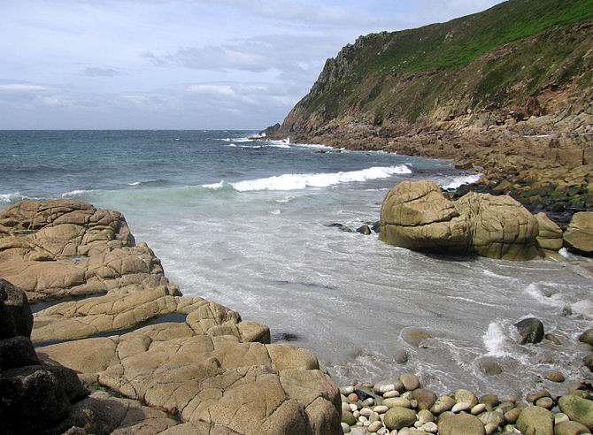 Porth Nanven (“port of the rocky valley”), also known as Pornanven, and colloquially as Cot Valley Beach, consists of a sandy beach covered with large rounded boulders. These ovoid boulders have earned Porth Nanven the nickname “Dinosaur Egg Beach”, and are the work of the sea grinding the rocks to a smooth shape over the years.