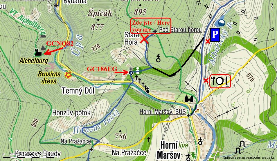 -= Krakonoš =- Stará hora, a tedy i tato keška, se nachází v území Temný Dul, což je cást obce Horní Maršov . Tato horská vesnice, která po sametové revoluci v roce 1989 zaznamenala velký nárust turistického ruchu, díky cemuž se stále rozrustá, je vzdálena cca 1km cestou lesem, nebo cca 3,6 km po asfaltové ceste. Horní Maršov je clenem Svazku obcí Východních Krkonoš a v neposlední rade také patrí do Krakonošova království.