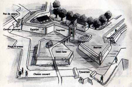 Le bastion remplace la tour (ronde ou quadrangulaire) : triangulaire, il est plus solide et offre moins d’angles morts. Désormais, la fortification se compose de 2 épais talus de terre, parallèles, soutenus par des murs et séparés par un large fossé (mur extérieur, contre-escarpe, mur de l’enceinte, escarpe). Les bastions sont reliés par des courtines. Entre les bastions, sont intercalées des demi-lunes. En appliquant le système des tirs croisés, superposés et rasants, chaque ouvrage défend et est défendu par l’ouvrage voisin. A l’extérieur du fossé, une levée de terre, le chemin couvert, constitue la première ligne de défense, d’où l’on balaie le glacis (longue pente dénudée que l’attaquant doit parcourir à découvert pour approcher les ouvrages fortifiés).