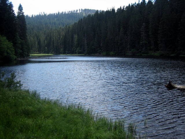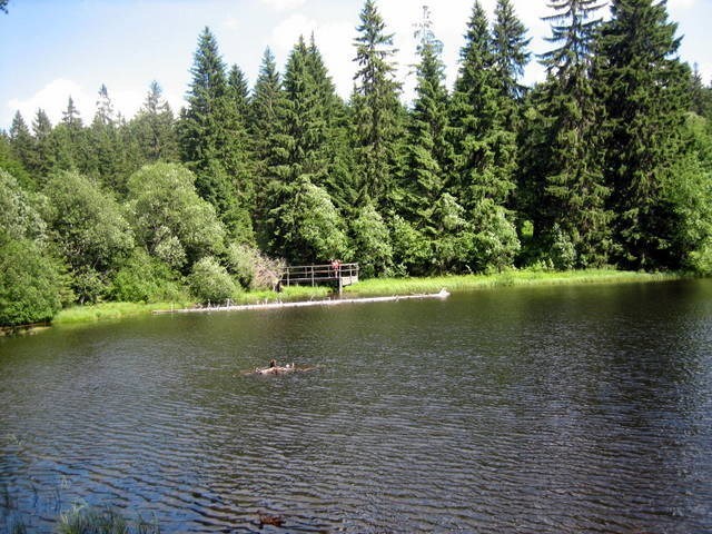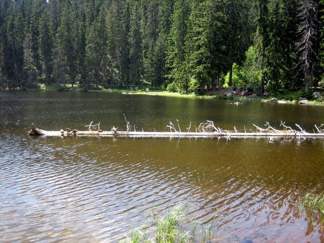 Lake Laka is the shallowest of all these lakes and it is the only one on the Czech side with islands and it is slowly being silted. Sediments have already been cleared (e.g. in the year 1906). Its flora is quite rich. On peat islands dominates mainly bent-grass (Carex canescens and C.nigra) and reed mace (Juncus bulbosus). The same plants grow on the lake’s strands. Among many kinds of algae are very rare ones listed on the Red List of Threatened Species (like Batrachospermum vagum or Binuclearia tectorum). In the last century, the lake was known as a home of many trouts, each year 400-500 was caught here and because of its breeding, the lake weir has to be heightened in the thirties. In the sixties, the trouts were still bred here but due to the waters’ oxidization, the fishes disappeared. Larger species living here are mainly eft (Triturus alpinus) and the great variety of spineless animals like dragonfly, stonefly, alderfly or sedge fly.