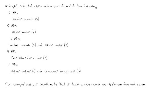 I was back in the area again not long ago and retraced a few of our steps. Yes, it is still fairly prickly! As I was ducking berry canes and dodging puddles, I saw a piece of paper out of the corner of my eye. It looked like a page torn from someone's research notes. The writing was messy and the paper was a bit splattered, but after taking it home I was able to transcribe the note into something a bit more legible.