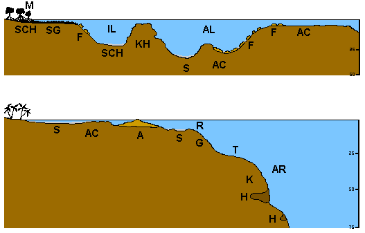 lagoon - I) Fine sand - K) Acropora corals - L) Algae ridge - M)
