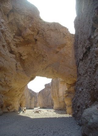 Natural Bridge Canyon, with an official trailhead, is one of the many easily explored side canyons in the cliffs on the east side of Death Valley. A short walk up from the parking area along the pebble floor leads to a large natural bridge, one of several such features in the national park - several more are found in Little Bridge Canyon near Stovepipe Wells. Natural bridge extends across the whole canyon and is quite impressive. The bridge is made of conglomerate with deep cracks running through the span. After the bridge the ravine bends a few times and enters a layer of red rock where the canyon narrows and at one point is partially blocked by a large boulder, but with room to pass underneath. Next is a big ….. (question 3) about 30 feet high. Above, the canyon seems to gain elevation more quickly, becomes shallower and branches several times. Other points of interest in the main canyon are several smooth vertical chutes in the walls, formed by flood waters flowing from hanging side canyons. Within the walls of Natural Bridge Canyon there are many faults of varying size exposed. All faults are connected with events which formed Death Valley. Most of them are still active. Small faults are visible at the mouth of Natural Bridge Canyon. They are recognized as linear fractures in the rock which have been filled with light sand and mud. It is often possible to observe the amount of movement caused by a fault, by tracing "bedding" and other laterally continuous features across the fault. A larger fault, which has caused the formation of a large cave, is visible just a short distance beyond Natural Bridge in the north wall of the canyon. At the head of the canyon is Badwater Turtleback Fault. The Turtleback Fault has been actively sliding rock down into Death Valley´s deepening floor for millions of years, resulting in a total offset of thousands of feet. An excellent exposure of Turtleback Fault is located at the head of Natural Bridge Canyon on the south (right) wall. Length: 1 mile to end of canyon, ½ mile to natural bridge.