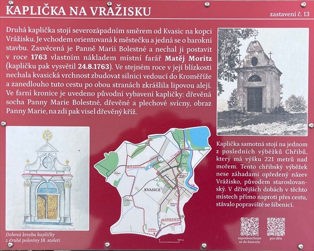 Tuto barokní kapličku najdeme severozápadním směrem asi jeden kilometr od Kvasic na kopci Vrážisku (222m), jednom z posledních výběžků Chřibů. Nechal ji postavit v roce 1763 vlastním nákladem farář Matěj Moritz, který v té době působil v Kvasicích. Ve stejném roce v její blízkosti nechala vrchnost zbudovat silnici vedoucí do Kroměříže a po jejích obou stranách byly vysázeny lípy. O stavbě kapličky se dovídáme z farní kroniky, kde se dále uvádí, že v kapličce byla dřevěná socha Panny Marie sedmibolestné, dřevěné a plechové svícny, obraz Panny Marie, na zdi visel dřevěný kříž. Jak již bylo výše uvedeno, jedná se o barokní stavbu s vchodem orientovaným k městečku. Kaplička má půdorys 3 x 4 metry, uvnitř je vydlážděna pískovcovými deskami. Štít kapličky zdobily po stranách dva kovové kříže, které se nedochovaly.