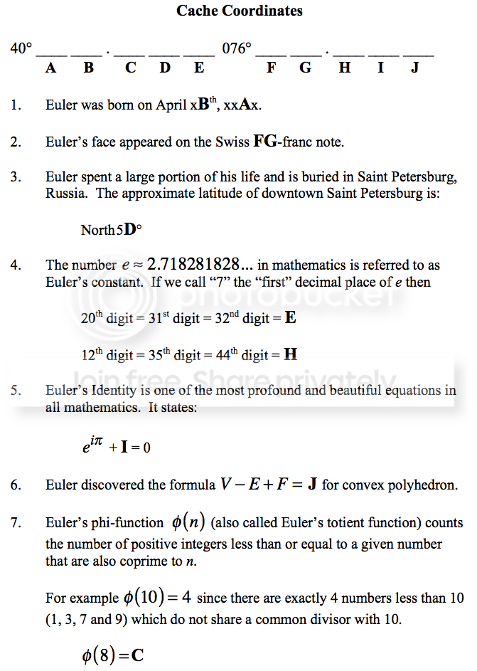 This puzzle cache is designed for you to become more familiar with "the Shakespeare of Mathematics." The correct coordinates of this cache can only be found by completing a short puzzle in which you will answer biographical and mathematical questions about the life and work of Euler. All of the answers are readily available online but may require a bit of creative searching.