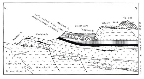 13=Raibler Schichten (Schlernplateau-Schichten); 14=Hauptdolomit