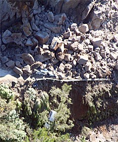 The gorge received some notoriety in August 2009 when a massive landslip from the bluffs above the road between the two bridges crushed one car and pushed another over the cliff towards the river. This was extensively reported in the news, and examples are found here and here. The final SH36 rockfall report was released in March 2010.