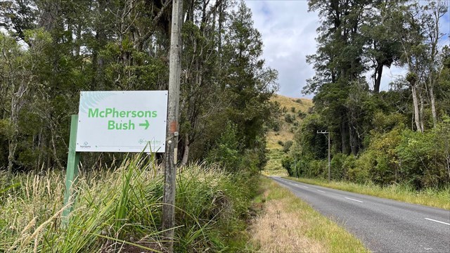 A Forest and Bird Reserve donated by Alex McPherson in 1940. See the WP to locate the entrance. Take the Yellow track (see track map in the Gallery). After finding the cache, complete the circuit - a walk of 45-60 minutes. The route is well signposted with yellow triangles. You are looking for a 100ml pill bottle in a distinctive tree beside the track.