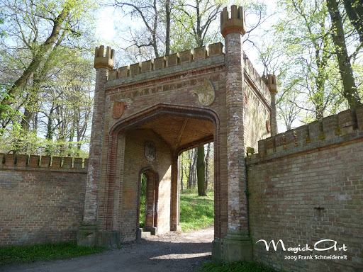 Der Park wird von einer Mauer bzw. einem Zaun umgeben, um die Öffentlichkeit von ihm fernzuhalten. Nur einige wenige Tore gewähren den Zugang. Das Greifentor stellt dabei den Haupteingang zum Schloßpark dar. Auf Steinpfeilern stehen zwei in Zink gegossene und vergoldete Greifen, die vom Bildhauer August Kiss geschaffen werden. Am nördlichen Ende des Parks, gegenüber von Sakrow, erlaubt das Jägertor den Zugang. Erbaut von Ludwig Persius, besteht es aus gelbem Backstein und ist in der Form eines Tudorbogens gehalten. Damit ergänzt es den in unmittelbarer Nähe befindlichen Jägerhof. Das Hirschtor an der westlichen Seite zieren zwei Bronze-Hirsche. Und schließlich ist da noch das Wildparktor.