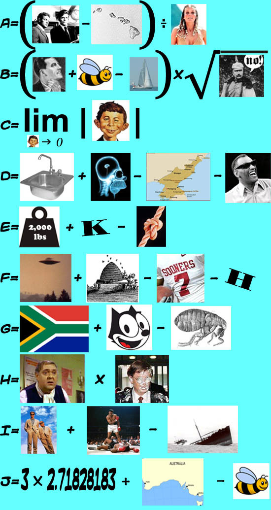 Above are some rebuses, well, kinda-sorta rebuses. You will have to think broadly to solve some. Resolve a single digit value for each letter.