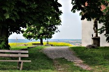Am Waldrand entlang kannst Du rechter Hand einen Blick auf die Überreste einer früheren Grenzbefestigung, den „Landgraben“, werfen. Dann links mit einem letzten Blick auf die Rheinebene und an der Bank rechts hinab. Links im Tal liegt Jöhlingen, rechts daneben kannst Du das Wössinger Zementwerk entdecken. Vor dem Waldstück links und gleich wieder rechts, bis Du auf ein Wegkreuz triffst. Rechts daneben steht ein Holzschild.