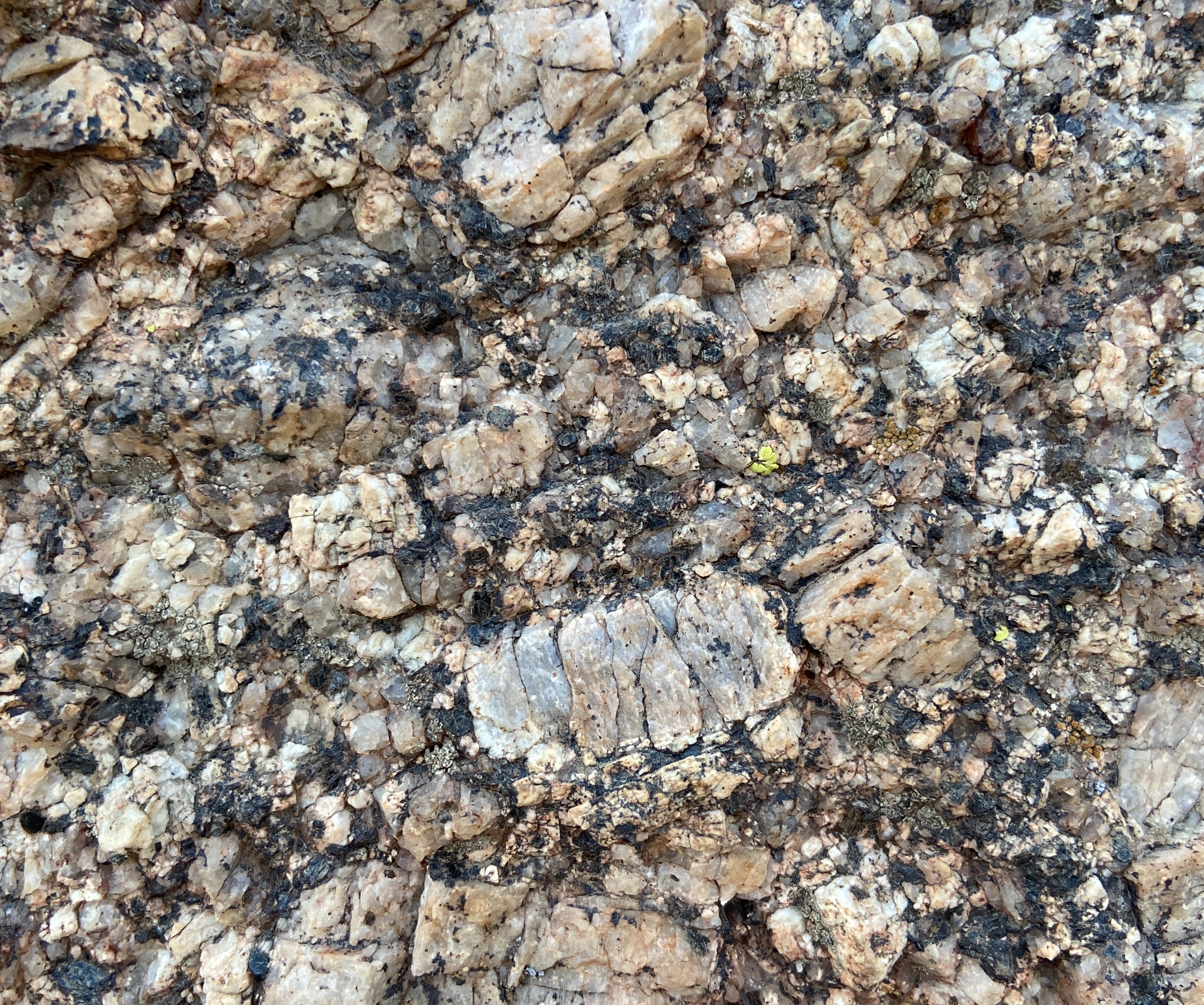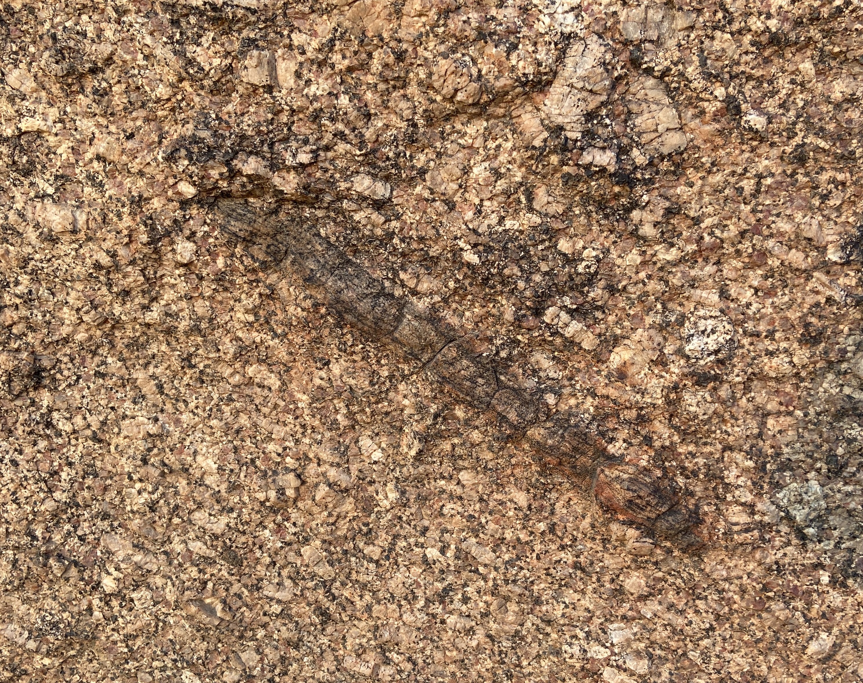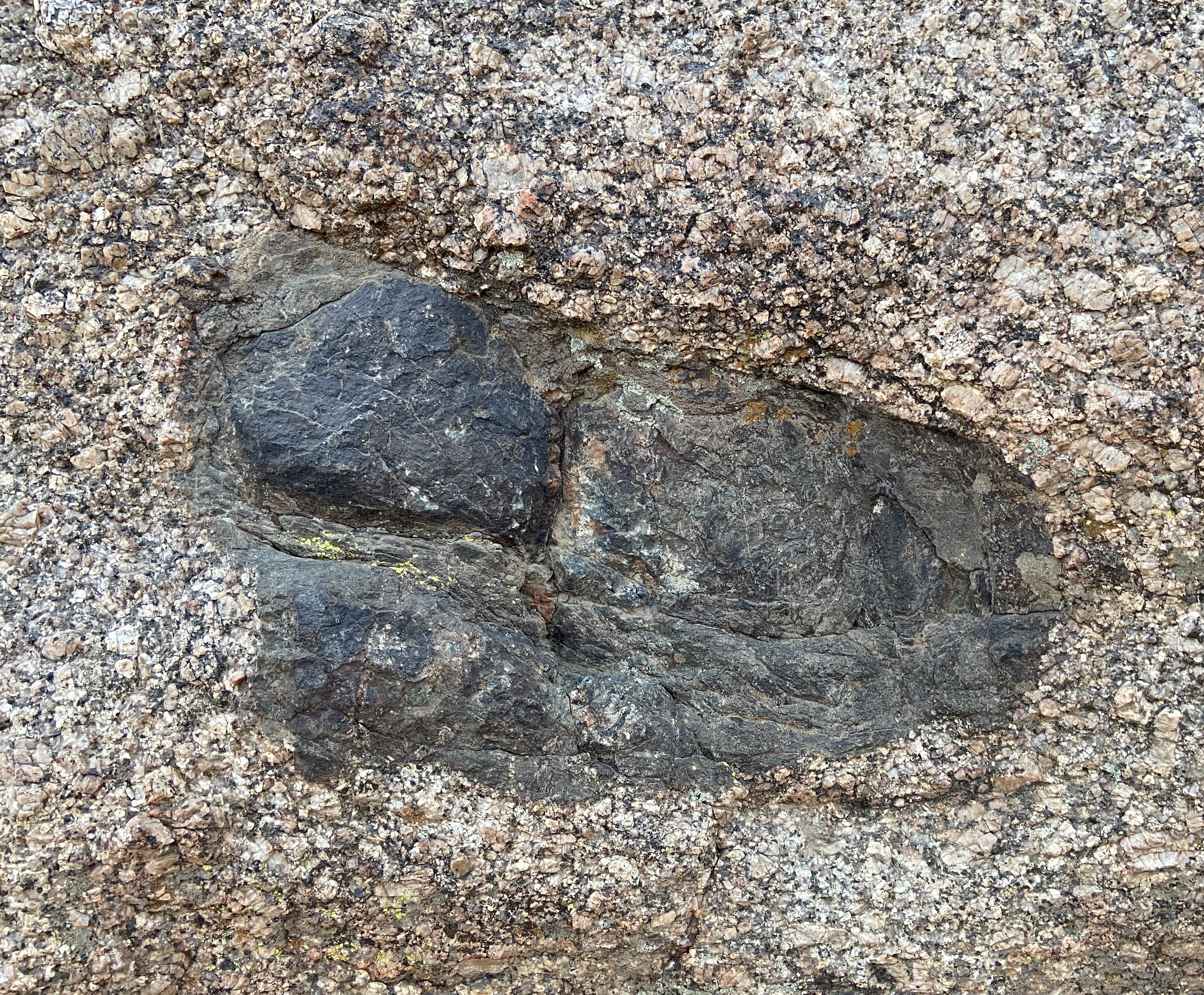 As magma flows into an area underground most existing solid rock is melted into the magma or displaced. Sometimes, however, pre-existing rocks survive being melted and instead are incorporated into the magma as it cools. These ‘foreign’ rocks within the solidified granitic mass are called Xenoliths.