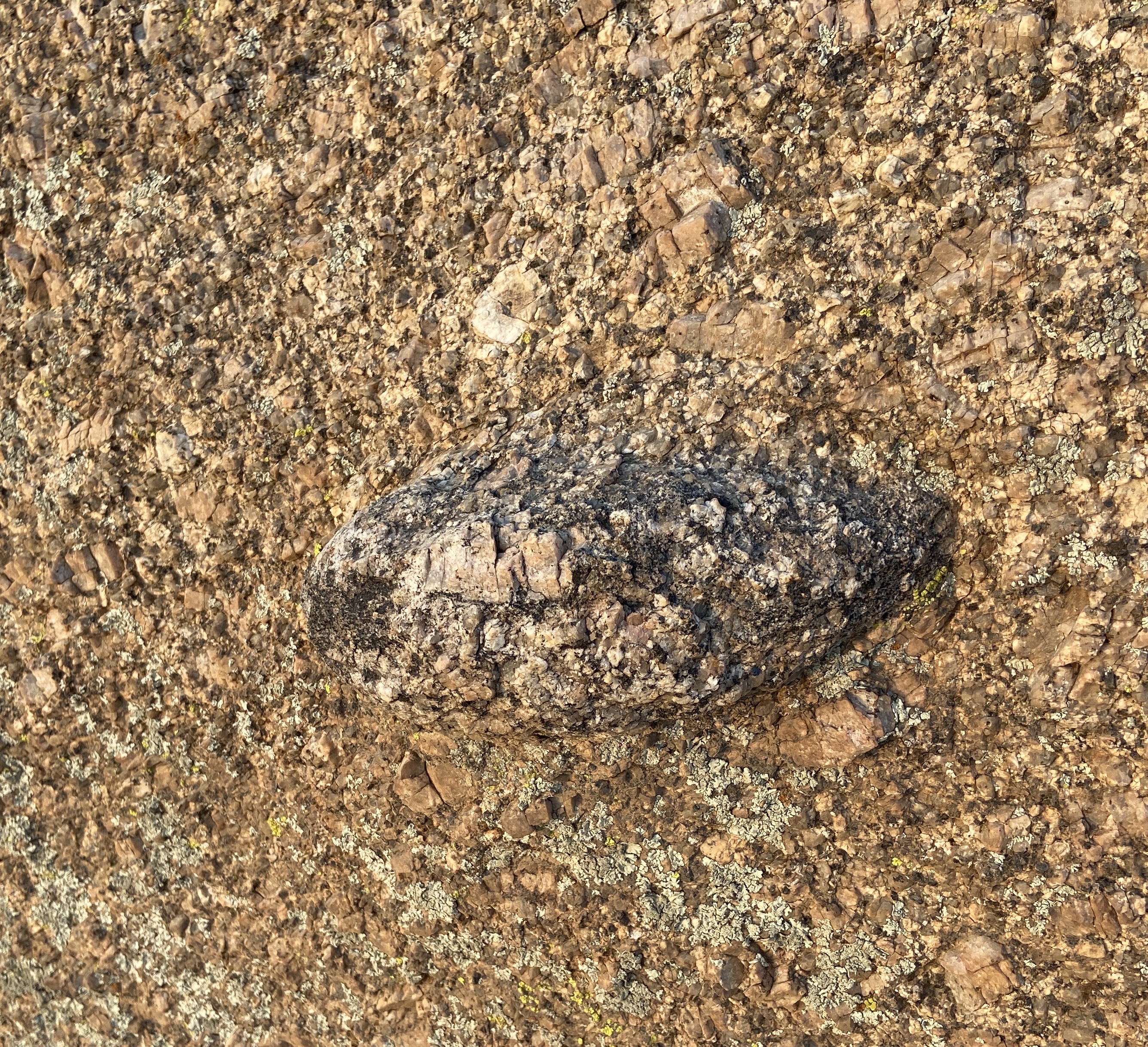 This granite cooled faster, resulting in finer crystals. Note how this rock appears harder with sharper angles, while the surrounding granite with larger phenocrysts is rounder and erodes more easily.