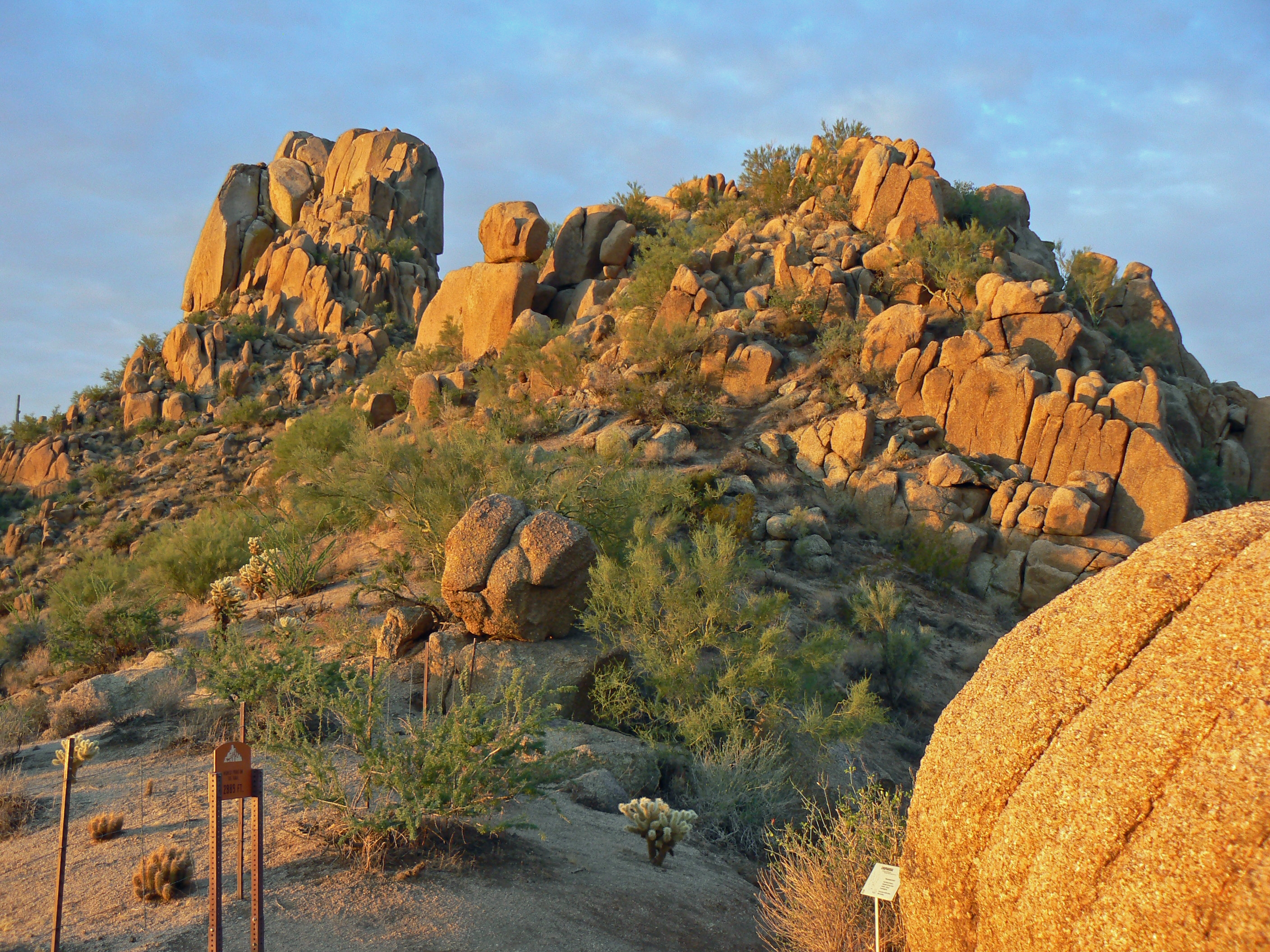 Overview of geology of Pinnacle Peak Park (from the Pinnacle Peak Park website): Pinnacle Peak, jutting skyward 600 feet from the valley floor, is largely composed of granite. The crystallization of slowly cooling molten rock deep in the Earth formed this granite over 1.4 billion years ago. The natural forces of faulting, erosion, and uplifting of overlaying rocks have uncovered this granite. Some of the common minerals that have formed this granite are quartz, biotite mica, and feldspar. The minerals formed an interlocking pattern as the magma cooled. Water and ice, combined with the forces of gravity and the passage of time has decayed and removed some of the minerals, leaving it in the rounded boulder shapes you see today.