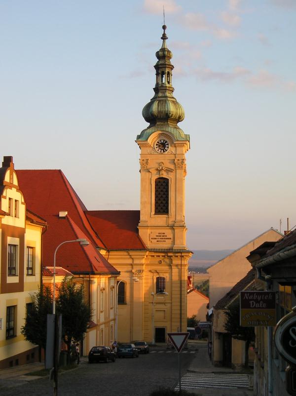 Barokní budova kostela byla postavena podle plánů kounicovského architekta Domenica Martinelliho, italského architekta nar. v r. 1650 v Lucce, kde také r. 1718 zemřel. Byl hodně činný ve Vídni a na Moravě a pracoval pro šlechtické rody Lichtenštejnů, Harrachů a Kouniců. Kostel dal postavit Hrabě Maxmilián Oldřich z Kounic v letech 1717 – 1733, kdy byl vysvěcen. Na impozantním průčelí vyniká zejména portál nad hlavním vchodem.