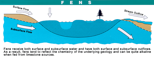 The feature that distinguishes fens from bogs is the fact that fens receive water from the surrounding watershed by way of streams and groundwater, while bogs receive water primarily from precipitation. Fens, therefore, reflect the chemistry of the geological formations through which these waters flow resulting in much variation among fens with respect to acidity. Fens can vary from acid fens to calcareous fens. Bogs on the other hand are associated with extreme acid conditions. In limestone areas the water is high in calcium carbonate resulting in fens that are typically buffered to a near neutral pH of 7.