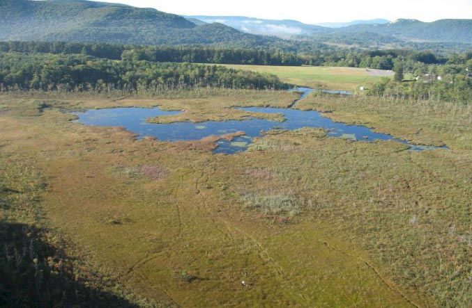 Situated within a 1,350 acre drainage basin, the 160-acre open fen consists of a floating sedge mat that overlies peat and lake clay deposits. Mineral weathering of marble bedrock supplies highly alkaline ground and surface waters to the fen basin. More than 20 state-listed plants and animal species occur in Kampoosa Bog, making it the best example of this wetland type in New England. |