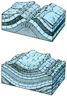 An anticline is a fold structure in which the sides of the fold slope apart. Its shape is concave downward. The younger rocks are generally found on the outside of the fold. Deep underground, anticlines are highly desired by petroleum prospectors. The rock beds trap rising hydrocarbon fluids, allowing oil and gas to build up in the pore space of the anticline rocks. The largest oilfields occur in large, gentle anticlines in thick sedimentary rock layers.