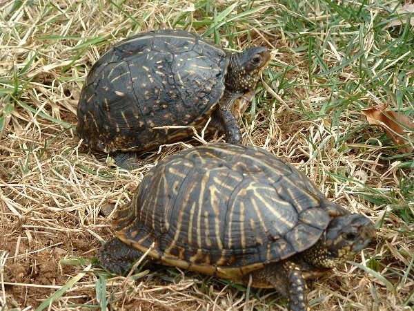Box Turtles are the most common terrestrial turtle in the eastern United States. They are small to medium sized turtles, attaining a maximum length of about 8 inches and having a highly domed carapace. A key characteristic of box turtles is their hinged plastron (bottom of the shell) that can be shut completely to exclude predators. Although mud, musk, and blandings turtles also posses hinged shells, they cannot be closed completely. Superficially, box turtles resemble tortoises but they are actually more closely related to many aquatic turtles and belong to the same family as spotted, bog, chicken, map, and painted turtles, as well as sliders, cooters, and diamondback terrapins. Box turtles in the United States are divided into two species, the eastern box turtle (Terrapene carolina), which ranges from Texas throughout the southeast and north to Michigan and southern Massachusetts, and the western box turtle (Terrapene ornata), which ranges west of the Mississippi to Colorado and New Mexico. The western box turtle is superficially similar to the eastern box turtle but is typically smaller and has a shell marked with radiating yellow lines. There are an additional two species of box turtle that are endemic to restricted habitats in Mexico. One of these species (Terrapene coahuila) is almost totally aquatic.