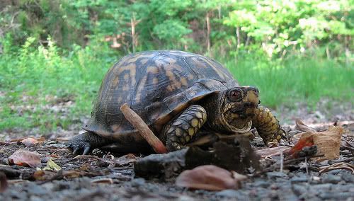 The Eastern Box Turtle (Terrapene carolina) is one of two species of box turtles found in the United States. It is the only "land turtle" found in North Carolina and is also the state reptile. Box turtles are extremely long lived, slow to mature, and have relatively few offspring per year. These characteristics, along with a propensity to get hit by cars, make the box turtle a species particularly susceptible to human-induced problems.