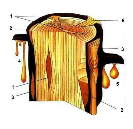 In a trunk resins are in particular channel system perfectly isolated from other vessels of wood; pressed tightly (to 20 atm); that is why after breaking channels they outpour easily.