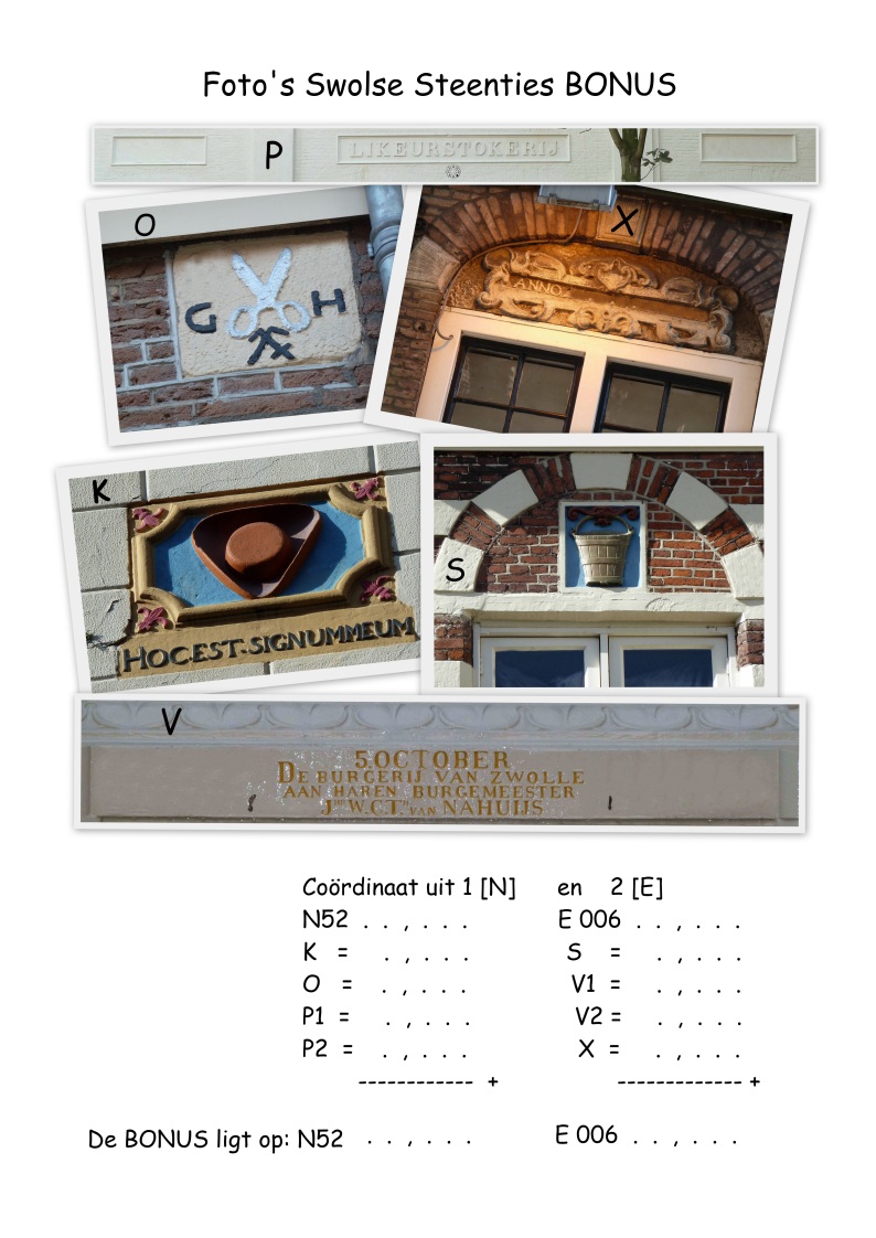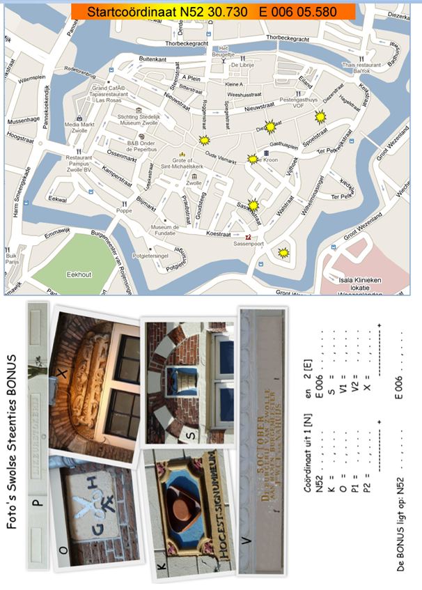 Opdracht: Bezoek de spots op de stadsplattegrond en vind de 6 gevelstenen van de foto's. Uit de “Swolse Steenties 1” heb je een Noord-coördinaat gekregen, uit de “Swolse Steenties 2” een East-coördinaat. Dit zijn NIET de coördinaten van de eindcache! Tel bij de Noord-coördinaat de jaartallen van K, O en P (2 jaartallen!) op. Deel de jaartallen door duizend. Het jaartal 1998 wordt dus 1,998. Doe het zelfde voor de East-coördinaat met de jaartallen van S, V (2 jaartallen!) en X.
