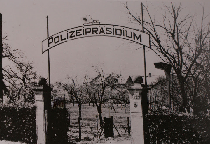 "Im zweiten Weltkrieg, nach der Brandnacht am 11. September 1944 bezog die Polizei hier Quartier. Durch die schweren Luftangriffe auf Darmstadt wurden auch die ehemaligen Dienstgebäude des Polizeipräsidiums in der Hügelstraße und in der Wilhelm-Glässing-Straße total zerstört.