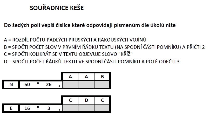 Po příchodu k pomníku vypočítejte dle přiložené tabulky finální souřadnice kešky.