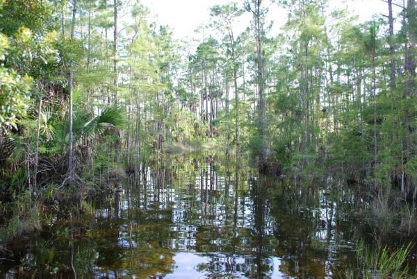 Water is the most important geological/environmental feature of Big Cypress National Preserve and because of that the Preserve was created. There are many factors that determine what organisms live in and around the water. One of these factors is water depth. Many aquatic species of plants and animals depend on the depth of the water to survive. The water depth varies throughout the Preserve depending on the amount of rain that falls and the elevation of certain areas. This causes some areas to have longer or shorter hydroperiods and determines what plants and animals are able to survive there. The deepest water is found in the Cypress Domes. Even during the dry season the centers of the cypress domes stay wet and provide habitat for the alligators. This is why they are often called alligator holes. The pinelands are often the driest areas resulting in species of plants that require less water such as saw palmetto, sabal palms and pines.