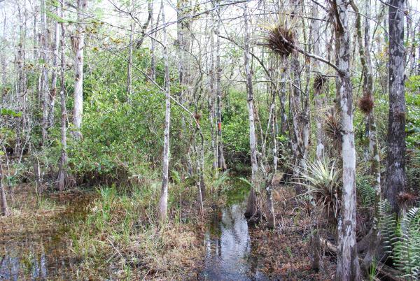 The Preserve gets its water mostly through rainfall, but also from the wetlands to the North and West. The water flows through the Preserve southward through the eastern portion of Everglades National Park. Along its journey it passes through many habitats that are used by wildlife and people in many ways. As in many parts of South FL the Big Cypress also has two main seasons wet and dry that drastically affect the water levels in many areas of the preserve, most of the ground in many of the habitats is mainly compose of sand, silt, clay, Miami Oolite and organic material. Solution holes which are made from Miami Oolite formations help hold most of the water in the swamp areas and determine the ground elevations on most of the dry areas such as Pinelands and Hardwood Hammocks.