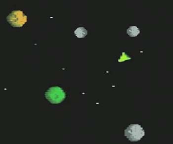 Asteroids used a black and white vector display. The player controlled a spaceship in an asteroid field which was periodically traversed by flying saucers. The object of the game was to shoot and destroy asteroids and saucers while not colliding with either, or being hit by the saucers' counter-fire.