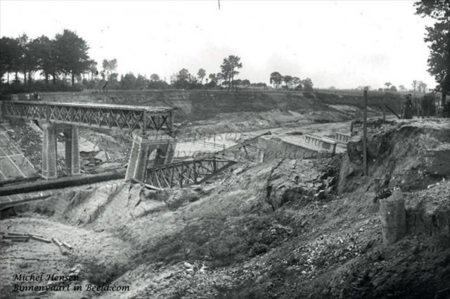 In 1910 the partially collapsed tunnel was dynamited and the canal was finished in a broad open air excavation. To fix the soil, the sloped walls were finished with a network reinforced concrete beams filled with brickwork. Also this attempt failed. In february 1913 the reinforced concrete broke and there was a land slide of some 15000 m³. A few months later, also the bridge pillars failed under the pressure of the "swim sands".