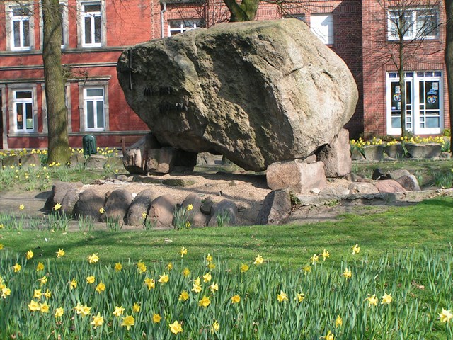 Der "Dicke Stein" wurde im Jahre 1933 in der nähe vom Töwerlandhotel von Jugendlichen gefunden. Da Steinfeld ein Kriegerdenkmal brauchte, war dies der perfekte Fund. Täglich versuchten 15 bis 20 Mann den riesigen Findling in den Ort zu schaffen. Dafür benutzten sie Schienen. Wegen der geringen Anzahl von Schienen wurden die hinteren immer abgeschraubt und vorne wieder angesetzt. So schafften sie am Tag 250 Meter. Nach drei mühevollen Tagen gelangte der 60 bis 65 schwere Stein am 13. März unter Jubel der Bevölkerung endlich auf die Dammer Straße.