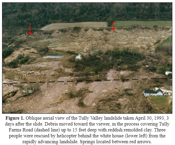 Without warning in the middle of the day on April 27, 1993, a landslide in the Tully Valley covered Tully Farms Road with as much as 16 feet of clay, destroyed three houses, lead to the evacuation of four other houses and caused a loss of drinking water for 15 homes north of the slide area. Three people were rescued from their homes by helicopter from the middle of the landslide. A total of 49 acres were transformed in a just few hours.