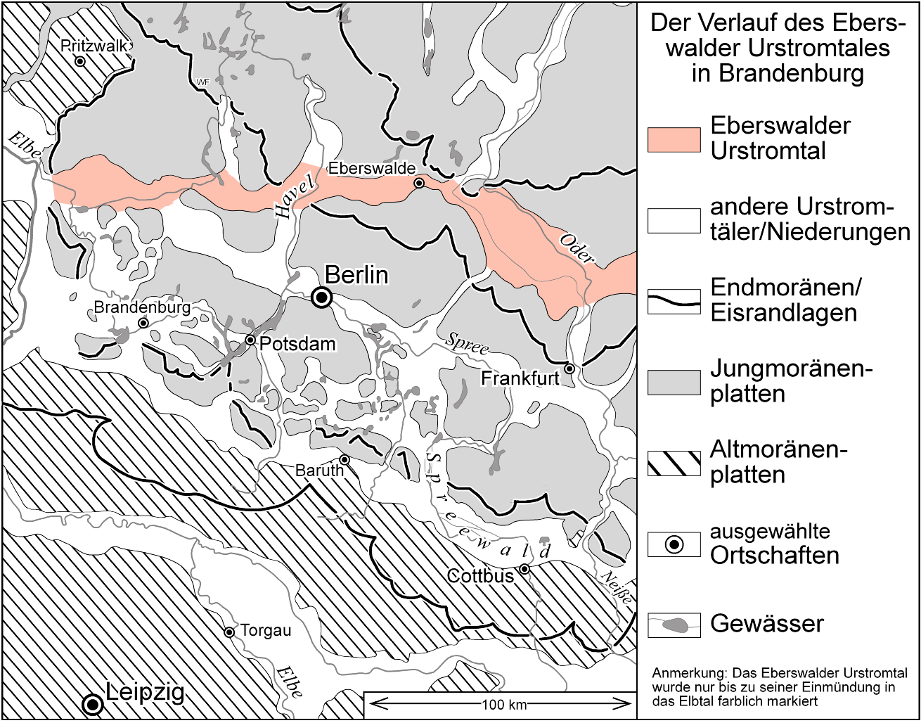 Das gesamte Eberswalder Urstromtal besitzt eine Länge von ca. 240 KM und eine Breite von ca. 10 KM. Es erstreckt sich vom Raum Torun (Polen) bis zum Berliner Urstromtal. Nördlich verläuft die Pommersche Eisrandlage. Hier findet man eine sicherlich weithin bekannte Sanderfläche: die Schorfheide.