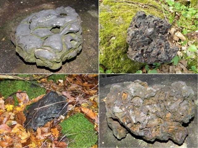 Die Bilder zeigen jeweils zwei Beispiele für Schlacken, einmal links massiv und rechts porös.