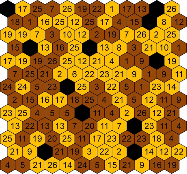 Der hier im Listing gezeigte Bienenstock (der Einfachheit halber nur in 2D) ist bevölkert mit vielen kleinen, fleißigen Tierchen. Jede Wabe enthält ein paar Arbeiterinnen (oder manchmal auch nicht), die einen der beiden richtungsweisenden Tänze aufführen. In den gelben Waben wird der Rundtanz vorgeführt, und in den braunen Waben wird ein Schwänzeltanz geprobt. Die Anzahl der beteiligten Bienen steht als Zahl in der Wabe.
