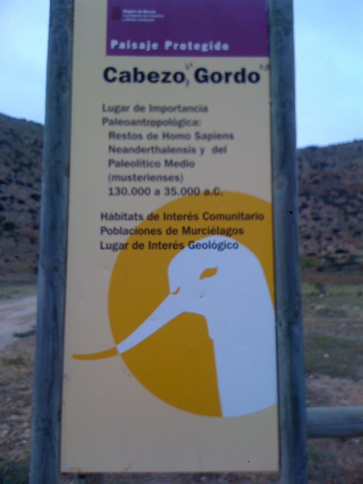 El Cabezo Gordo es el monte más alto de la gran huerta del Campo de Cartagena, en el término de Torre Pacheco. Desde su cumbre se divisa una amplia panorámica ( Mar Menor y Campo de Cartagena).Restos de Homo Sapiens