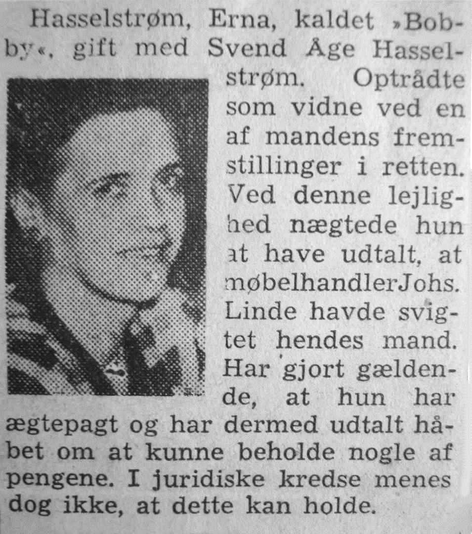 Den mest kendte af damerne var sortbørshandleren Svend Hasselstrøms ("Edderkoppen")38 årige hustru Erna Ida Marie (af vennerne kaldet "Bobby"). Erna og Svend Hasselstrøm havde dog kun en schæferbastard.