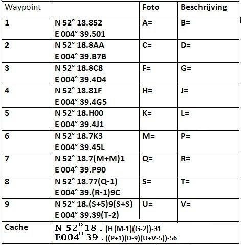 Startpunt is gelijk waypoint 1. Hier is voldoende ruimte om de auto te parkeren. Aanbevolen wordt om de route per voet te volgen. Bij ieder kunstvoorwerp dient U een foto en een ( al dan niet cryptische) omschrijving van het kunstvoorwerp te passen. Noteer het cijfer van de foto of het cijfer van de beschrijving achter de betreffende letter.
