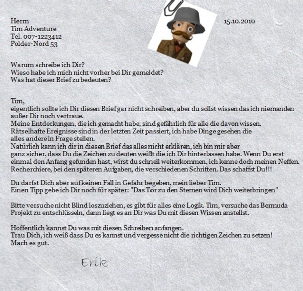 "Mein Onkel Erik ist seit einigen Tagen verschwunden, einfach so. Ich verstehe das nicht, er wollte mir dieses Wochenende doch was wichtiges mitteilen und nun ist er weg. Vielleicht hat es etwas mit seinen merkwürdigen Benehmen der letzten Tage zu tun. Er wirkte auf mich ziemlich zerstreut und aufgeregt, so kannte ich Ihn gar nicht. Ich habe in seiner Wohnung diese Karte gefunden und dann kam auch noch dieser komische Brief heute mit der Post."